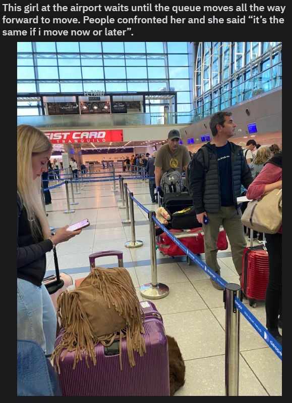 This is a debate I have internally almost every time I'm waiting in traffic. Naturally you want to move up every inch as soon as it becomes available... But does it matter? This young woman doesn't think so and is not going to be bother by those who hate her for it.