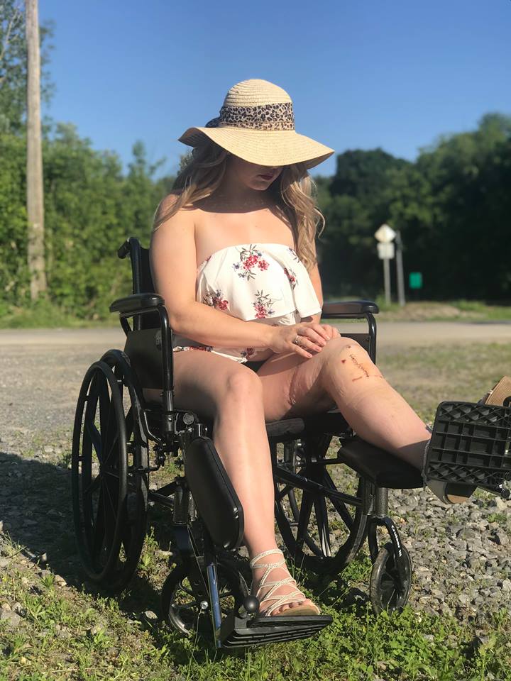 Adams has marked the third anniversary of the incident with a photo shoot - photos of her in a wheelchair or on crutches, scars and all.