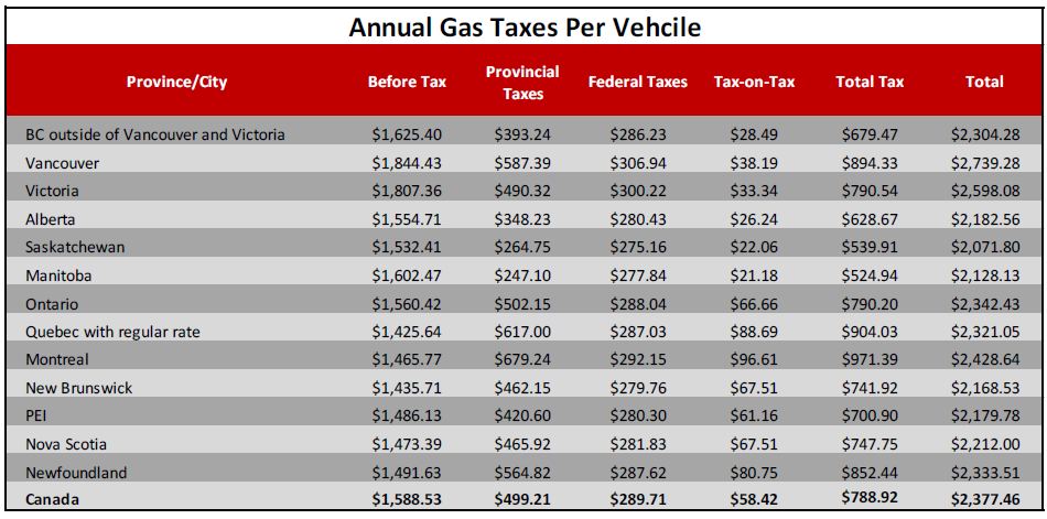 Montrealers/Quebecers also pay the highest (tied with Newfoundland) amount of tax-on-tax. Both levels of government calculate sales taxes after all the per-litre taxes are added, costing you about five cents per litre.
