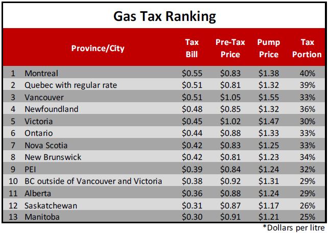 "On average, 33 per cent of the price at the pump is gas taxes," said CTF Federal Director Aaron Wudrick. "Montreal has the highest gas taxes in the country."