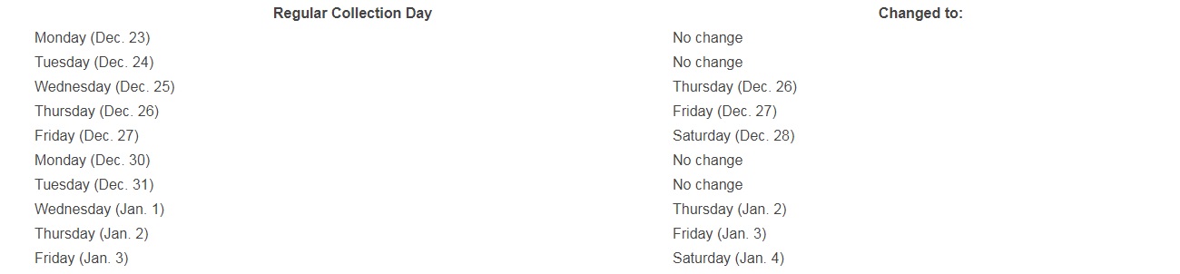 Garbage, Blue Box, Grey Box, and Green Bin collection will be deferred by one day in the week following Christmas Day in 2019 and New Year’s Day in 2020.