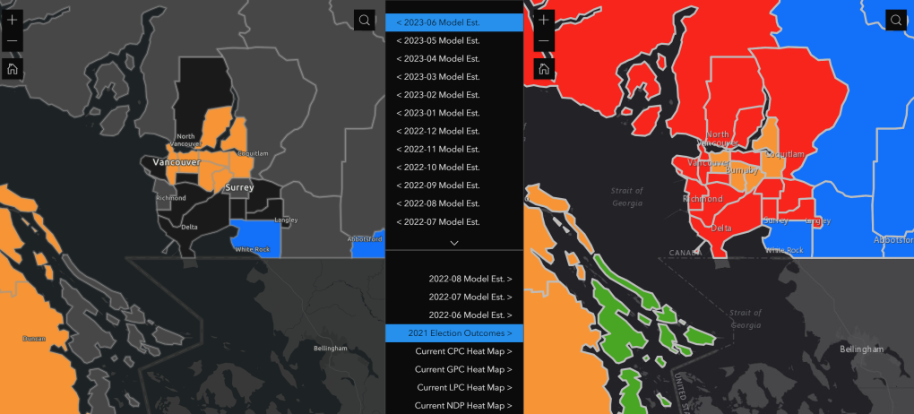 Nanos Research's current seat projections in B.C.'s Lower Mainland (on left), election results in 2021 (on right).