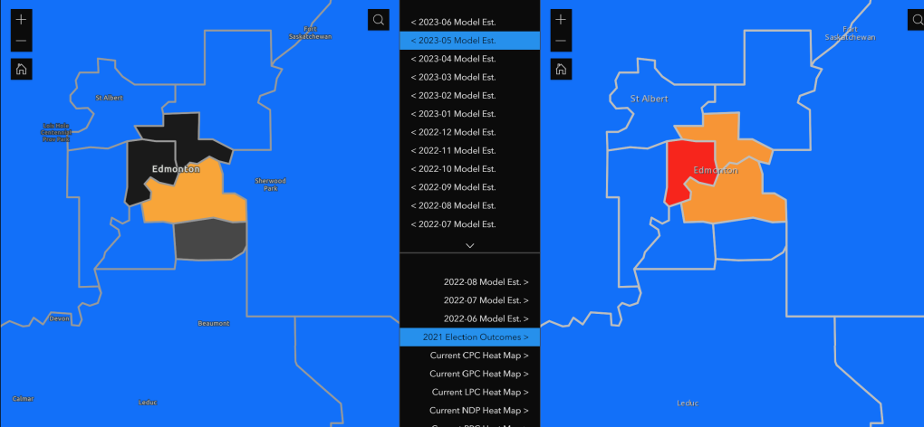 Nanos Research's current seat projections in Edmonton (on left), election results in 2021 (on right).