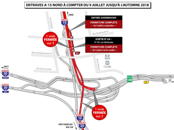 The nightmare won't end there, as Highway 15 north will lose one between Turcot and the N.D.G. and so will the ramp connecting Highway 20 and Route 136 (Ville Marie) to 15 north, also until September.