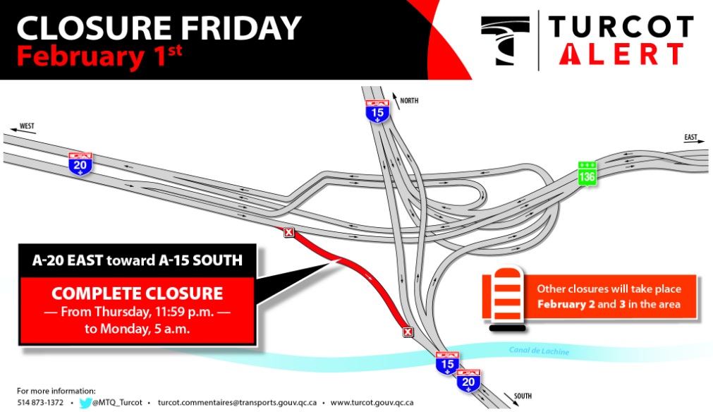 À compter du 31 janvier, 23 h 59, jusqu’au 4 février, 5 h, la bretelle menant de l’#A20 est à l’#A15 sud (vers le #pontChamplain) sera fermée à la circulation. D’autres entraves dans le secteur sont prévues. https://t.co/28pcYcSCUD