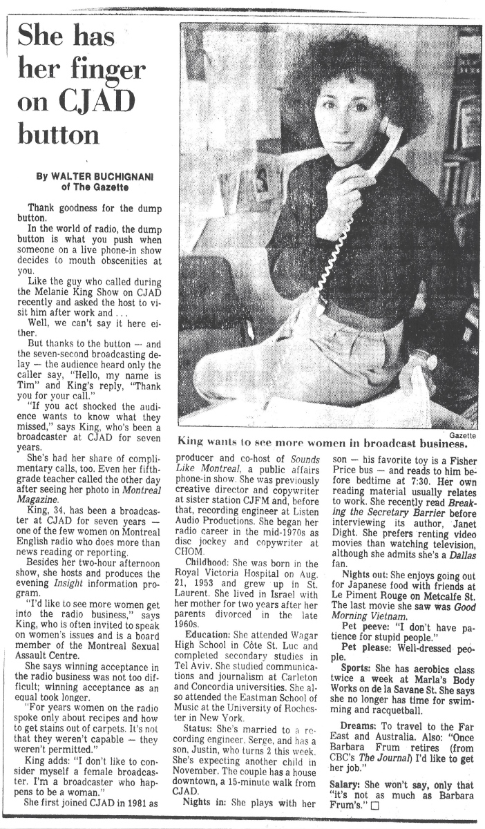 King arrived at CJAD 800 in 1981, after first spending a few years copywriting for CJFM and then completing a Masters in Journalism at Carleton University in Ottawa.